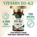 Nature’s Nutrition Vitamin D3 K2 Supplement combines D3 K2 Vitamin 5000 IU with 100 mcg of MK-7 for complete support of bones, teeth, and immune support. This powerful duo of Vitamin D with K2 ensures calcium is absorbed and guided where your body needs it most. Our chewables feature a delicious berry flavor, making D3K2 easy to take every day. Crafted with non-GMO ingredients, this clean formula delivers Vitamin D3 5000 IU K2 in a convenient chewable form. Perfect for anyone seeking high-quality Vit D3 K2, Vitamin D3 with K2, or Vitamina D3 con K2 supplements.