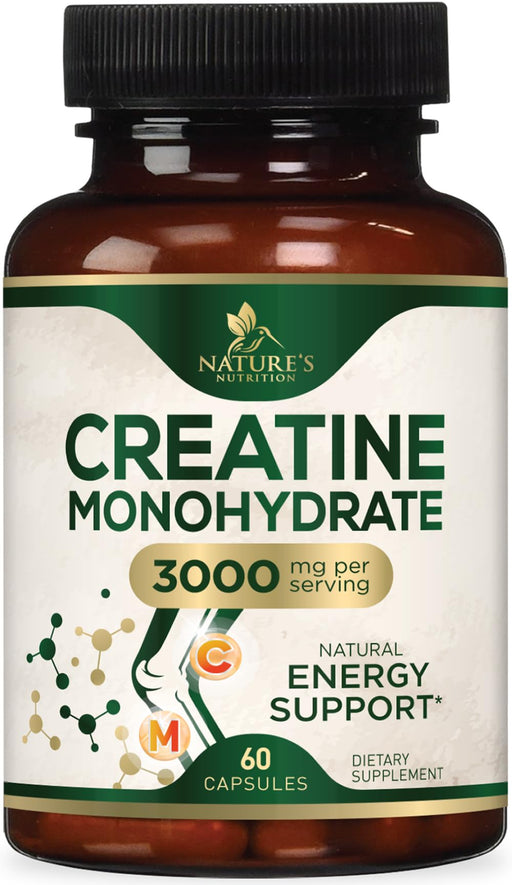 Creatine Monohydrate Capsules 3000mg – Best Micronized Creatine Powder - Supports Lean Muscle, Strength, Energy, & Endurance - Nature's Supplement, Non-GMO, Gluten Free for Women & Men - 60 Capsules