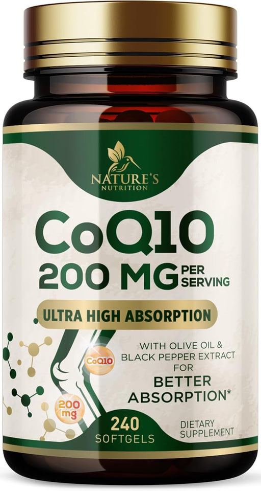 CoQ10 200mg Softgels - Extra Strength Coenzyme Q10 Supplement With Black Pepper Extract for Enhanced Absorption, CoQ10 Antioxidant Supplements for Heart Health & Cellular Energy Support - 240 Softgels